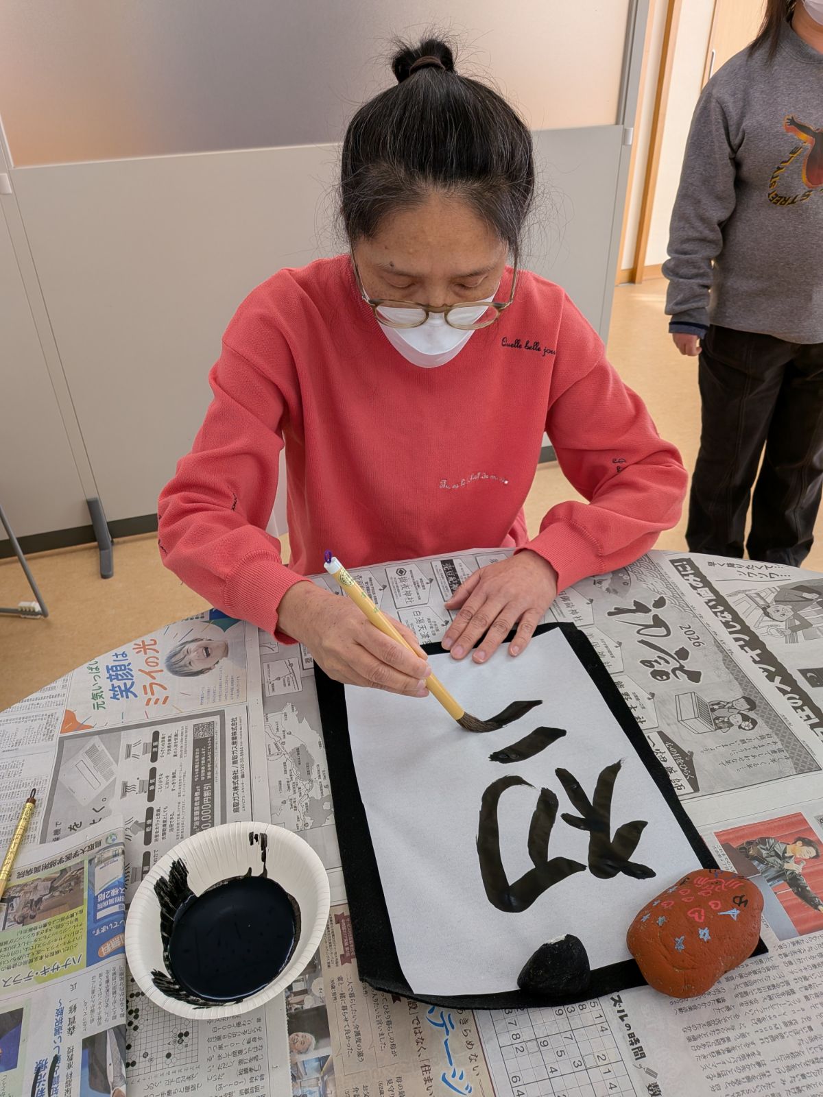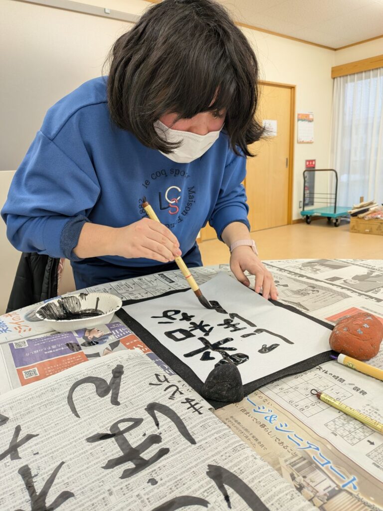 あおぞらでは、仕事始めからの一週間を『書き初め週間』として誰でも自由に書道を楽しめるスペースを作りました。