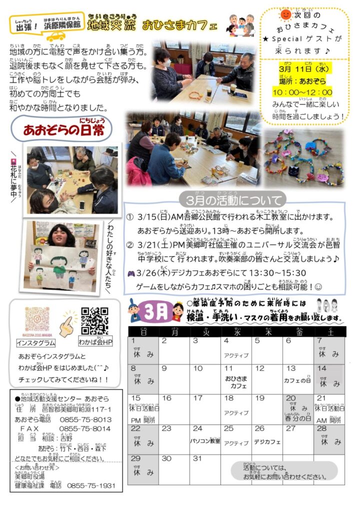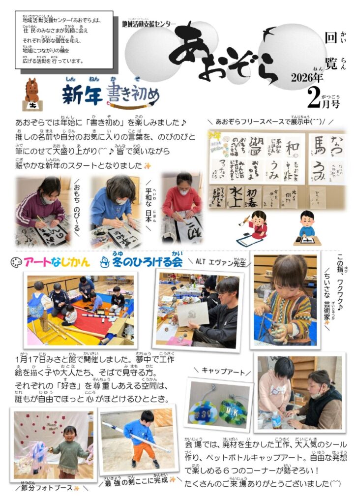 今月のあおぞら通信では、新年の書き初めの様子や🎨アートなじかん冬の広げる会など地域の方との思い出をお届けします。(^^)/