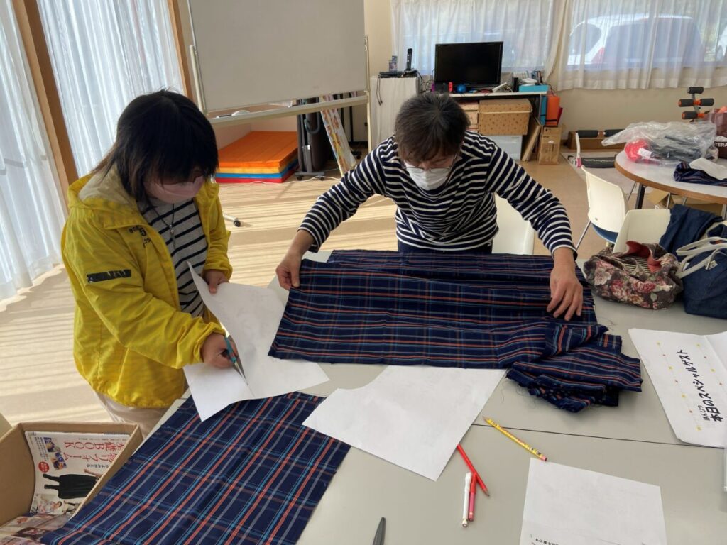 初回の会は、グループホームの世話人さんが参加され着物でワイドパンツを制作。参加者からは「こんな風にワイドパンツは作られるのね」と驚きの声。