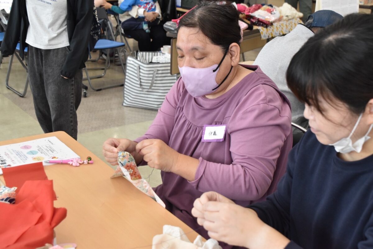 2回目には、ご自身で着物リメイクをされた服を着て参加された地域の方。手芸とおしゃべりをゆっくり楽しんで行かれました。手しごとを通して新しい出会いや交流が広がりました。
