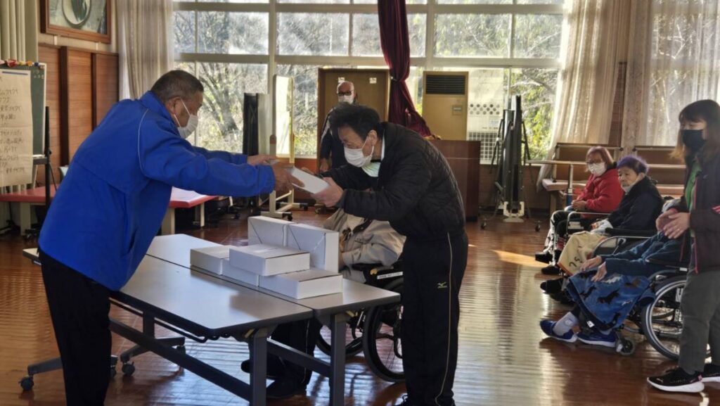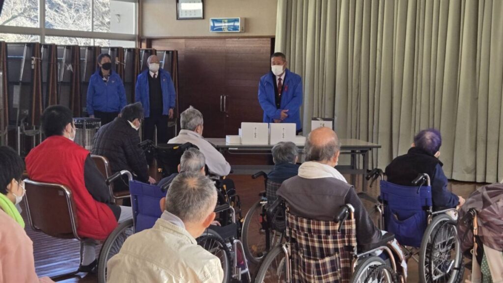 お知らせ邑智園 邑智大和ライオンズクラブ様による蕎麦贈呈式 12月18日に邑智大和ライオンズクラブ様より蕎麦を頂きました。 以前は蕎麦を邑智大和ライオンズクラブ様と一緒に蕎麦打ちをしておりましたが、感染対策等のため作ることは難しくなっており、ここ数年は作っていただいた蕎麦を邑智園に贈呈してもらっています。 頂いた蕎麦は利用者さんの食事で提供をしており、皆さん毎年楽しみにしておられます。 今年の蕎麦も食べられるのをとてもウキウキして待っておられます。