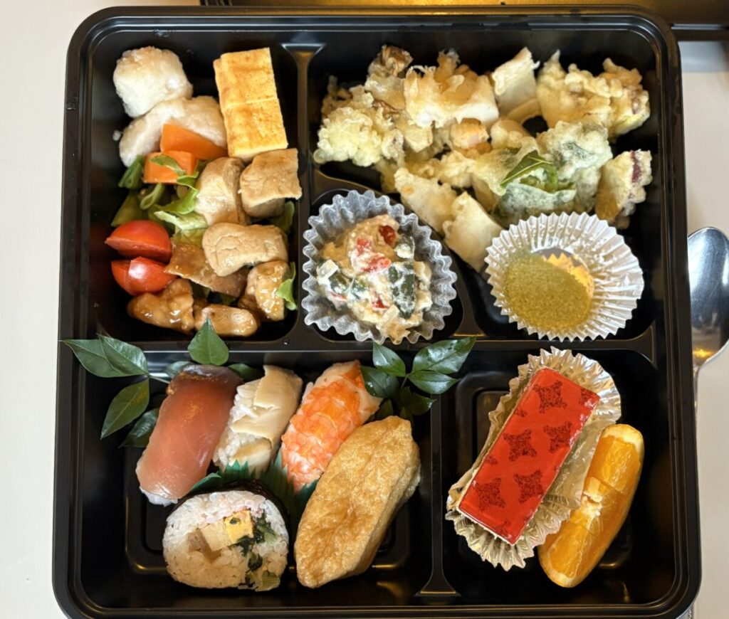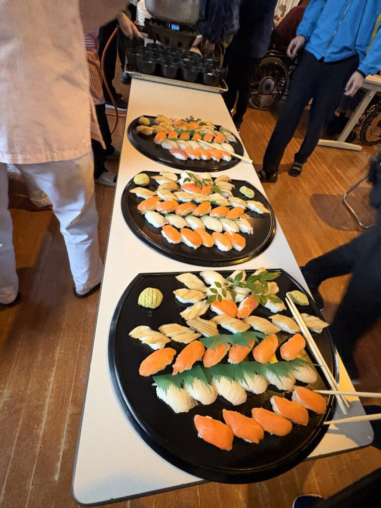 今回の忘年会では、邑智園が契約している ナリコマフーズ様のお弁当 とそれとは別に 、お寿司・ラーメン・ケーキなどの特別メニュー も準備していただきました。